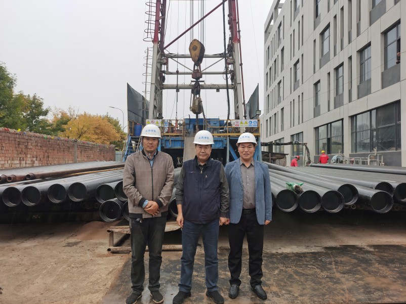 在施工现场,任创业认真听取了负责人关于开采井和回灌井的井身结构设计及造斜位置等情况介绍,详细了解了当前工程进展及下一步工作计划,实地查看了钻机安装及井场布置、钻井废泥浆的处理及排放情况。他强调,一是要抢抓机遇,充分发挥技术优势,以地热资源开发利用为核心,打造地勘“金字招牌”。二是要高标准、严要求、强落实,加强文明施工和安全生产,做好工地标准化建设,保质保量完成项目工作任务。