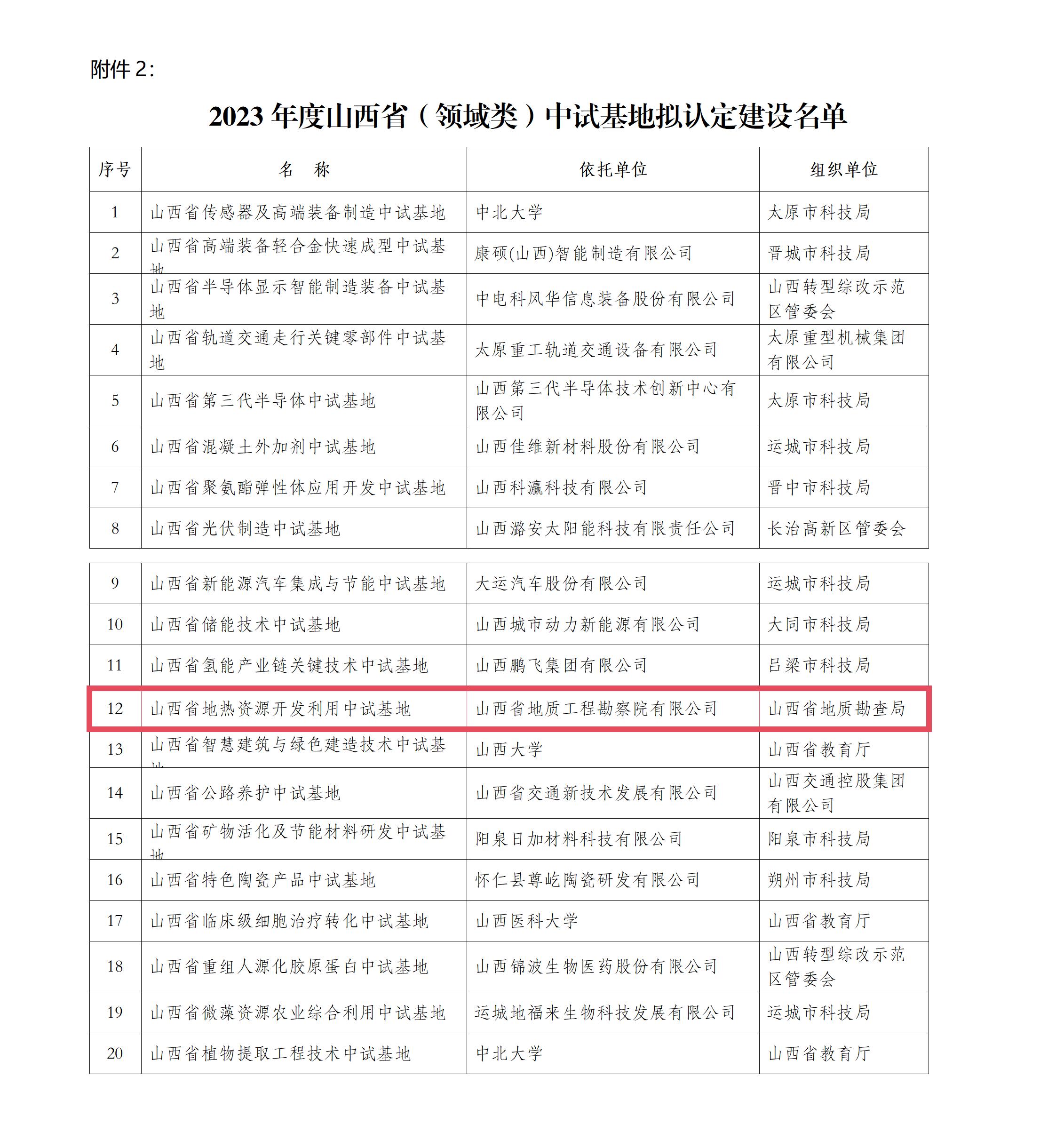 10月26日,省科技厅公示2023年度山西省中试基地拟认定建设名单,“山西省地热资源开发利用中试基地”成功入选,公示期为10月26日至11月1日。