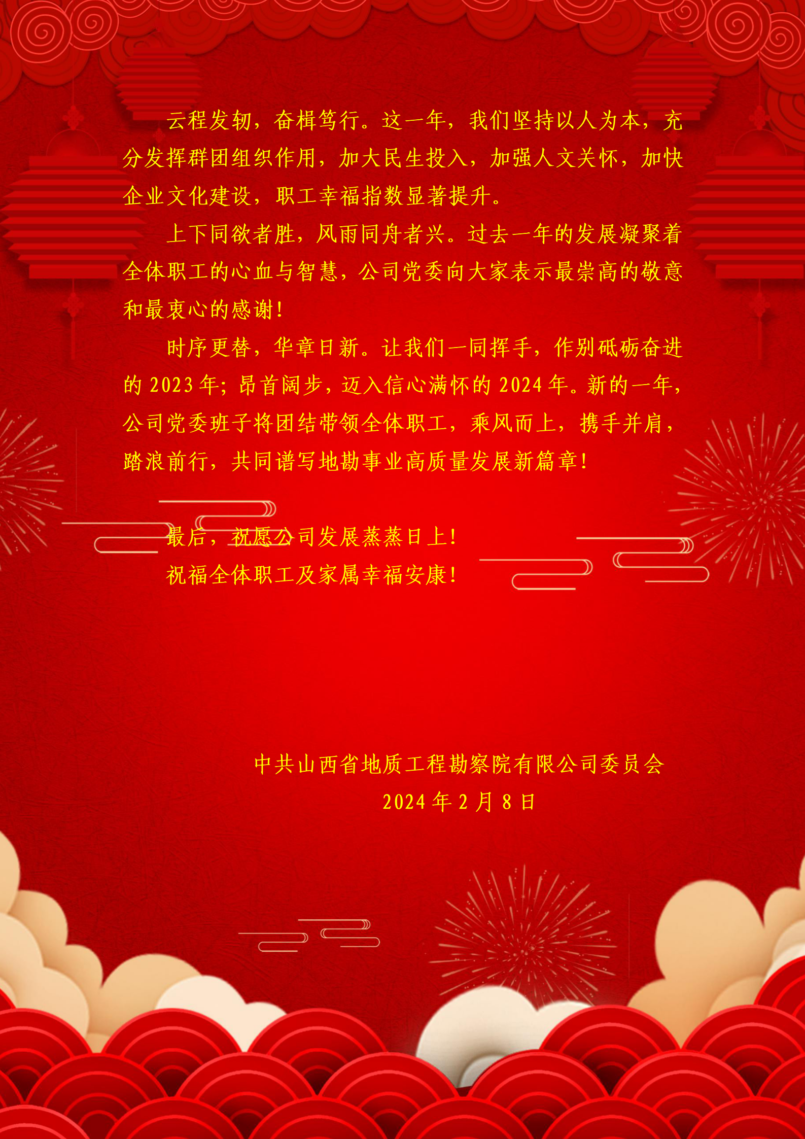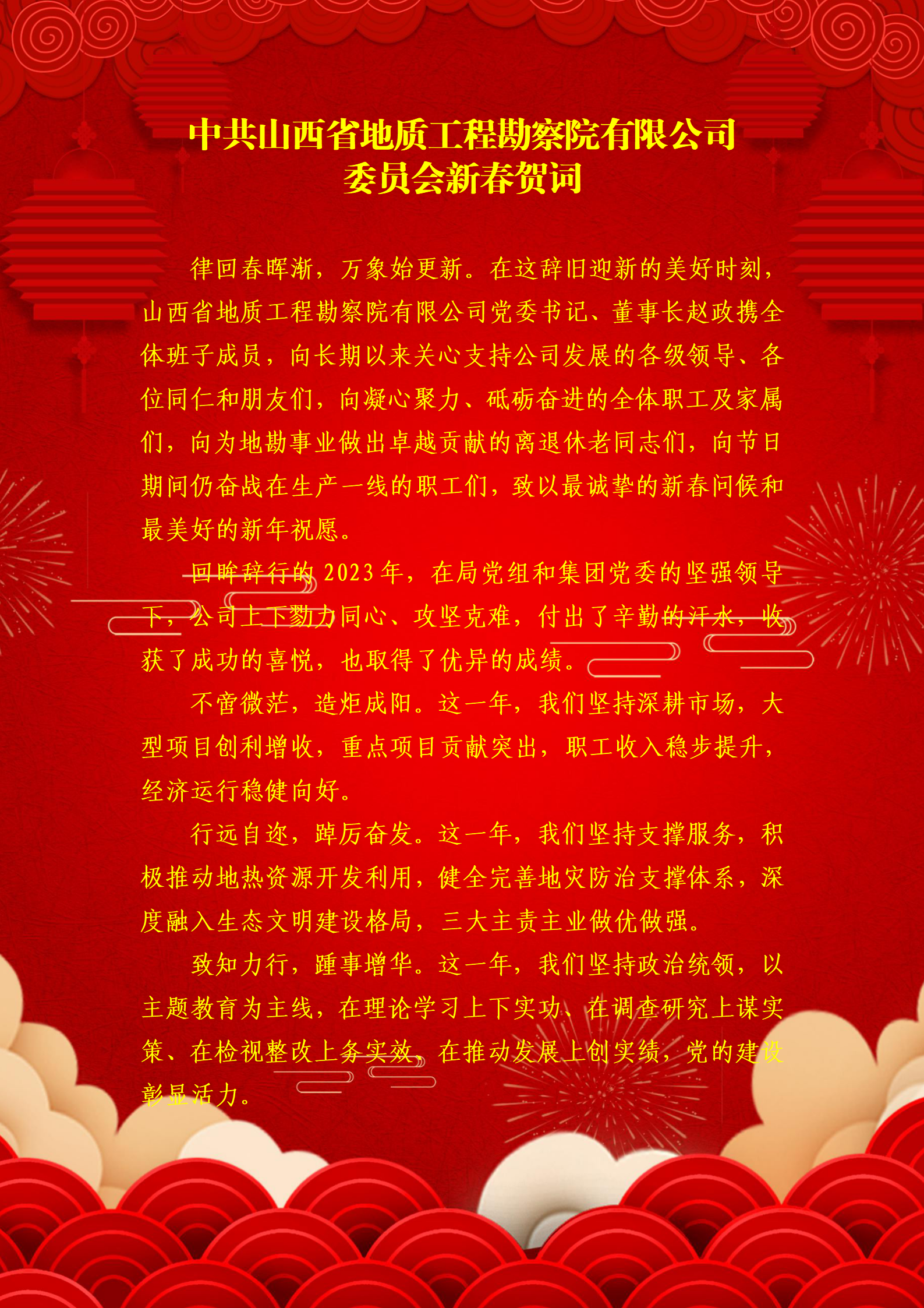 【概要描述】 律回春晖渐,万象始更新。在这辞旧迎新的美好时刻开云(中国)Kaiyun·官方网站党委书记、董事长赵政携全体班子成员,向长期以来关心支持公司发展的各级领导、各位同仁和朋友们,向凝心聚力、砥砺奋进的全体职工及家属们,向为地勘事业做出卓越贡献的离退休老同志们,向节日期间仍奋战在生产一线的职工们,致以最诚挚的新春问候和最美好的新年祝愿。
