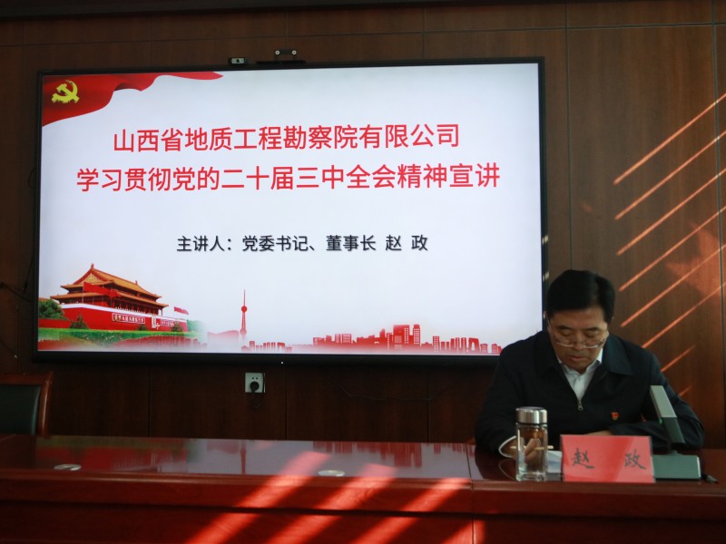 10月11日,地勘院有限公司召开学习贯彻党的二十届三中全会精神宣讲报告会。公司党委书记、董事长赵政宣讲党的二十届三中全会精神,党委副书记、副董事长、总经理施红政主持报告会。