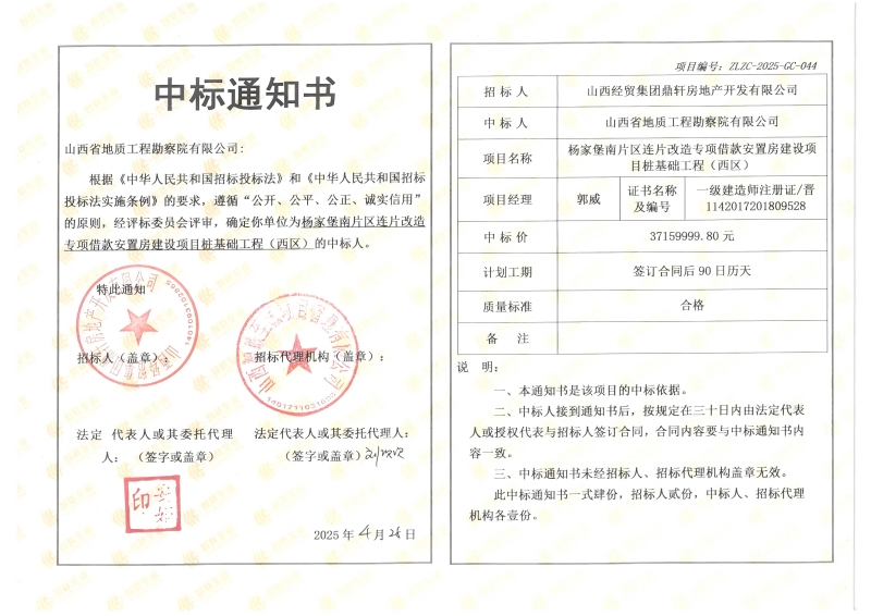 4月28日,开云(中国)Kaiyun·官方网站下属岩土工程公司中标杨家堡南片区连片改造专项借款安置房建设项目桩基础工程(西区)项目,中标价:37159999.8元。